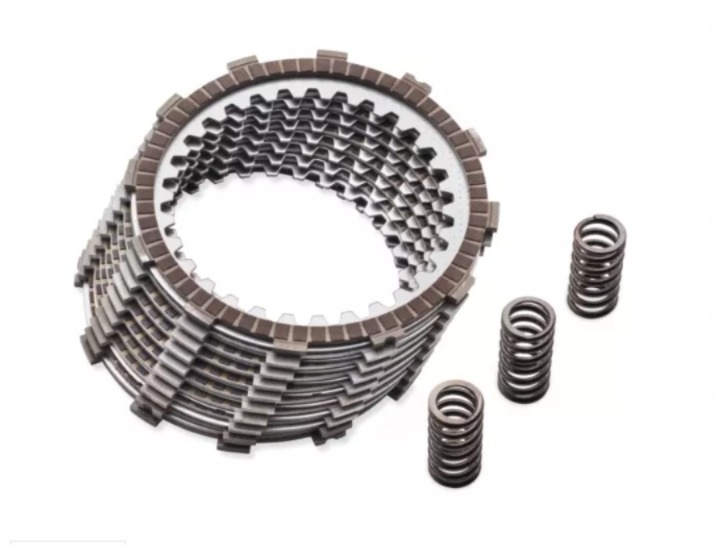 Комплект содержит 10 фибровых дисков сцепления (на один больше, чем в оригинальной комплектации), 10 контактных пластин и 3 пружины сцепления с усилием 1200 Ньютонов.